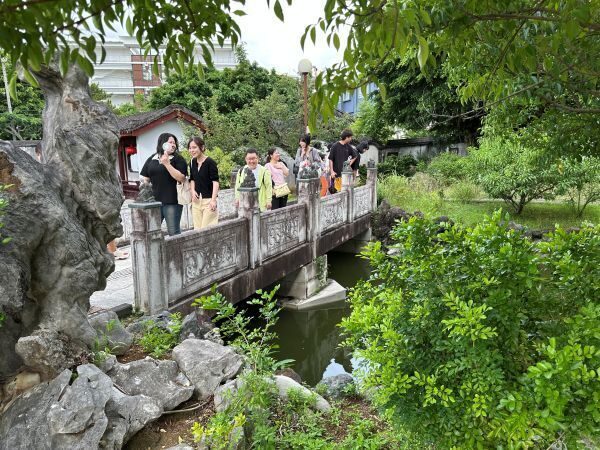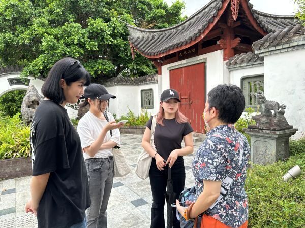 渡邉先生は、インターネット上の仮想現実(VR)を使った効果的な語学学習に取り組んでいて、ゼミ生たちはこれまで先生が制作したVR空間で福州園を見学したことはあったそうですが、実際に巡見するのは初めてで、また中国語を使って日本語学校の学生さんと対話できるとあって、積極的に交流を楽しんでいました。