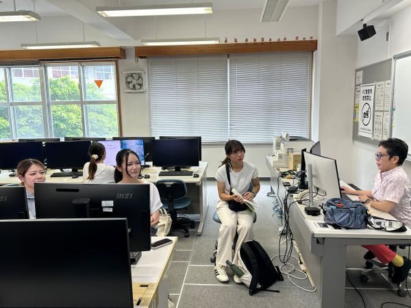 この日、取材に訪れたのは、琉球新報社でインターンシップ中の高校生で、台中市に住むジャン イーホエさんです。渡邉ゼミが取り組んでいる、音声認識機能を使った発音教材作成・授業支援システムSTlabについてやVR空間を利用した言語の学びについて、また今年度はゼミ生それぞれが週に3回程度、日記記事の投稿をしていて記事掲載にあたりaiの通訳機能の課題等を考えながら学びを深めていることを紹介しました。