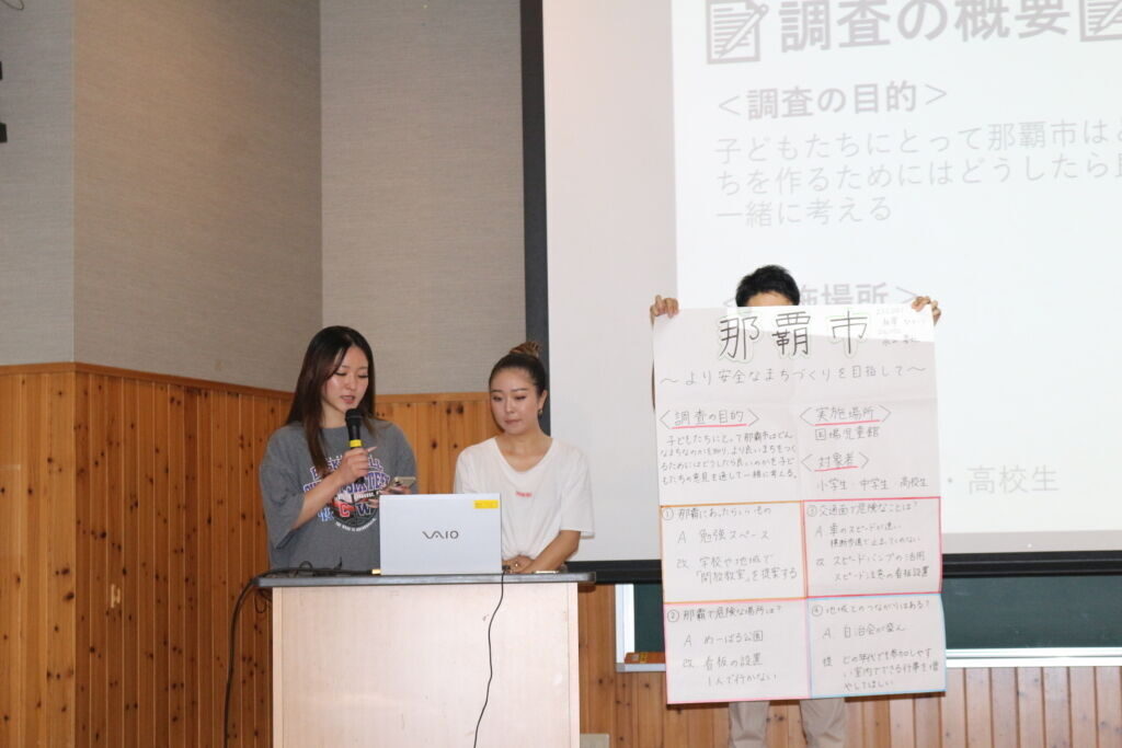 沖縄市内で400人を対象に大規模アンケートを実施し、子どもたちの夢や地域への要望を調査。「地域づくりには子どもたちの声を反映することが不可欠」という気づきを得て、行政や学校と連携した子ども参加型のまちづくりの提案を行いました。