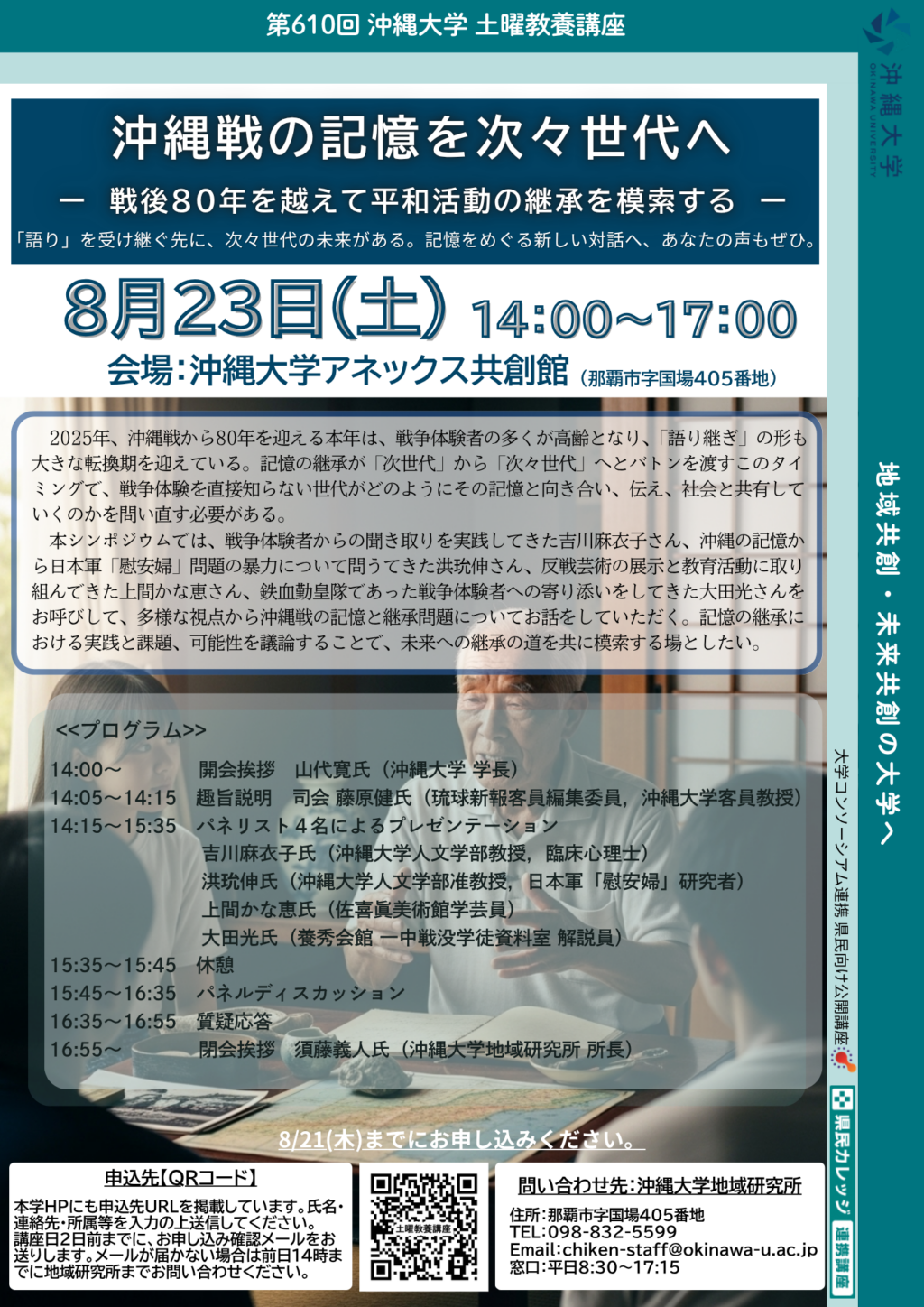 第610回沖縄大学土曜教養講座「沖縄戦の記憶を次々世代へ ―戦後80年を越えて平和活動の継承を模索する―」 開催のお知らせ 8月23日(土)14:00~17:00