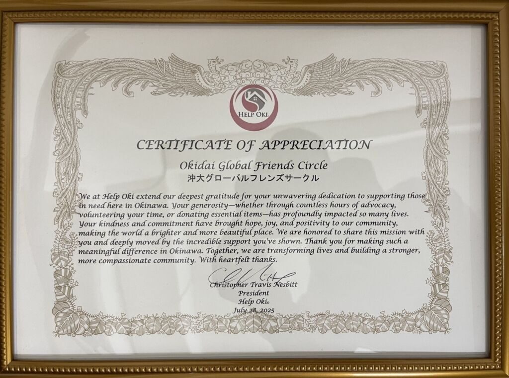 沖大グローバルフレンズサークルは7月29日、ボランティア団体「HelpOki」へ衣類の寄付を行い、感謝状が贈られました。