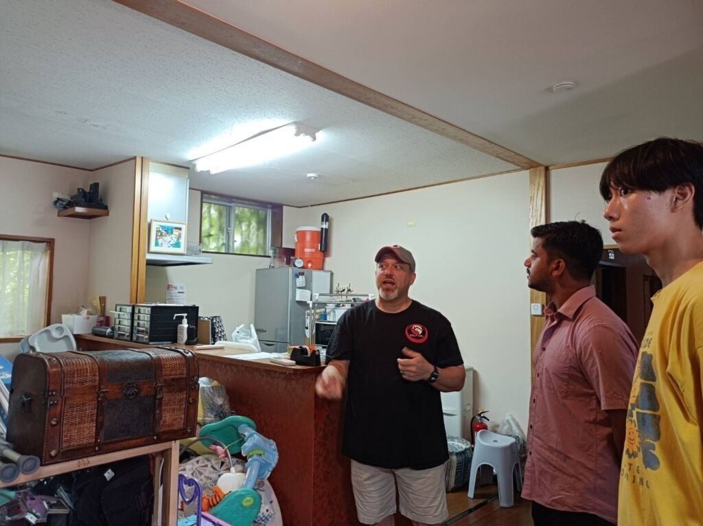 写真左から:沖大グローバルフレンズサークルの村田 海渡行さん(国際コミュニケーション学科2年次)、サハ ラフル クマルさん(国際コミュニケーション学科3年次)、HelpOkiのChristopher Travis Nesbittさん
