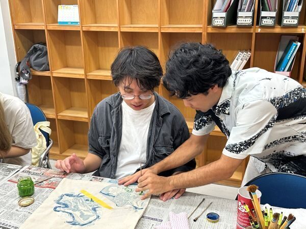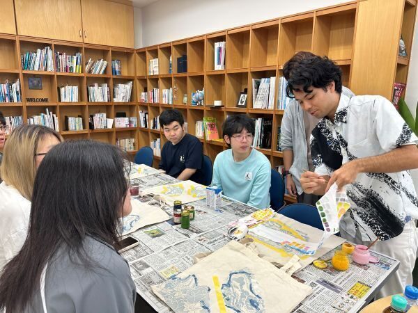 8月7日、台湾、中国、韓国から本学へ留学にきている6人の留学生たちが沖縄を代表する伝統的な染色技法「紅型」体験をしました。