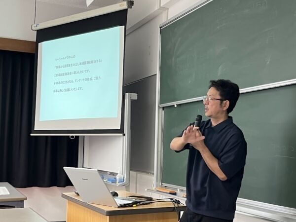 当日は、島袋教授による前期活動および夏季休暇期間中の学生の自治会行事参加の振り返りに続き、古島自治会の西平博人会長を講師に迎え、学生への講話が行われました。