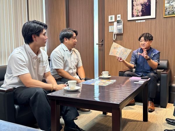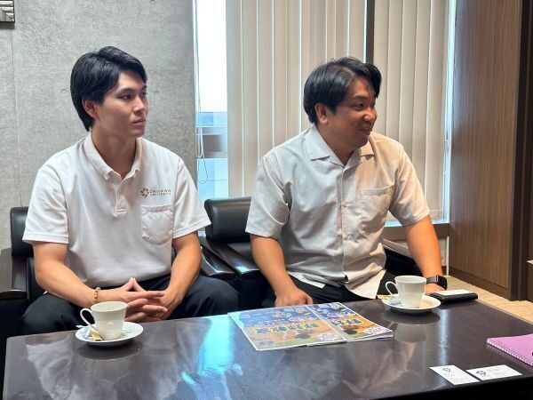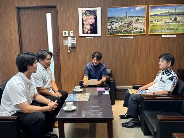 10月7日、軟式野球部所属の國吉翔太さん(福祉文化学科4年)と玉城祥梧監督が西原町の崎原盛秀町長を訪問し、来月開催する野球教室の報告を行いました。