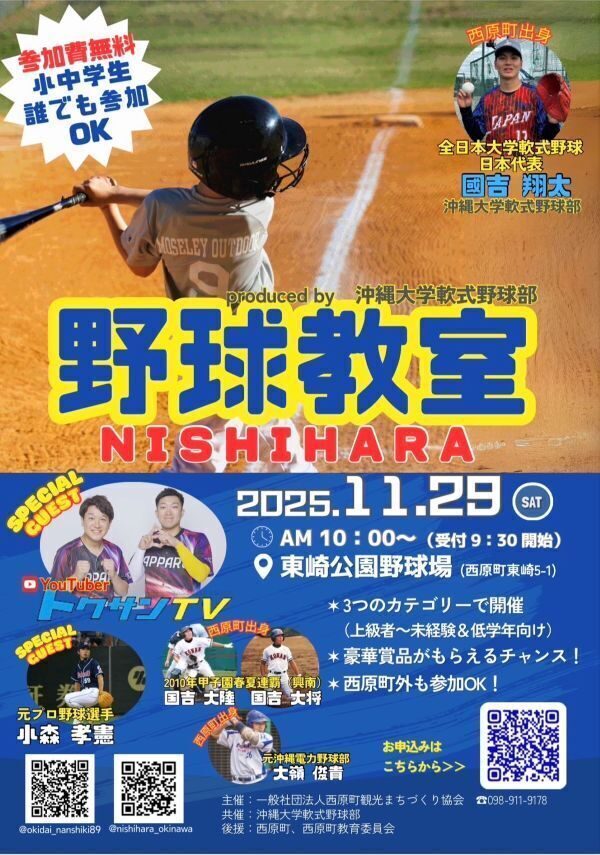 昨年軟式野球の日本代表に選出された國吉翔太さん、その報告で崎原町長を表敬した際に町長からかけられた「今年は日本代表として頑張って、その後西原町のためになにか貢献してほしい」との言葉を実行にうつしたいと、部員や監督と企画した野球教室が来月開催予定です。軟式野球部からは今年も日本代表が選出され(金城幸太郎さん)、國吉さんと金城さんを中心に部員たちが児童へ指導を行うほか、元プロ野球選手や甲子園で活躍された元選手たち、人気ユーチューバーをゲストに招くなど、楽しみ盛りだくさんのイベントとなっています。