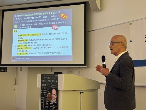 シンポジウムは、本学の山代寛学長による開会の辞で幕を開け、午前の部では北海道大学の田邉鉄教授による「AI時代の中国語能力とは」という研究発表が行われました。お昼休憩を挟み、午後にはCEFR研究とAIの語学教育応用で著名な京都大学名誉教授・大木充先生が登壇。「全部見せます!AIを用いて教科書を作成、AIを用いてタスクを作成」と題した特別講演では、近著『AIを外国語教育で使わない選択肢はもうない』の内容を中心に、AIによって変わる外国語教育の具体例と普及の必要性について語られました。